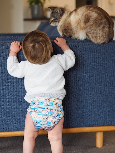 Our signature and most popular style, this All in Two (AI2) cloth nappy is trim fitting, super absorbent and stylish. Your little one will be comfortable with stretchy soft elastics and premium fabrics including our exclusive hand painted artwork printed onto our PUL.