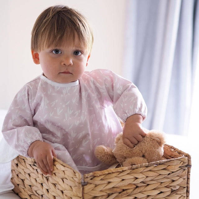 We used these smocks with our first child for weaning and are using them now years later with our second child. When our first was weaned we used them for messy play so they’re really versatile. I love that they come in two sizes so they’re not too big for when babies first start weaning and you can use them for years with the bigger size. They wipe clean and provide really good coverage to keep clothes nice and clean!