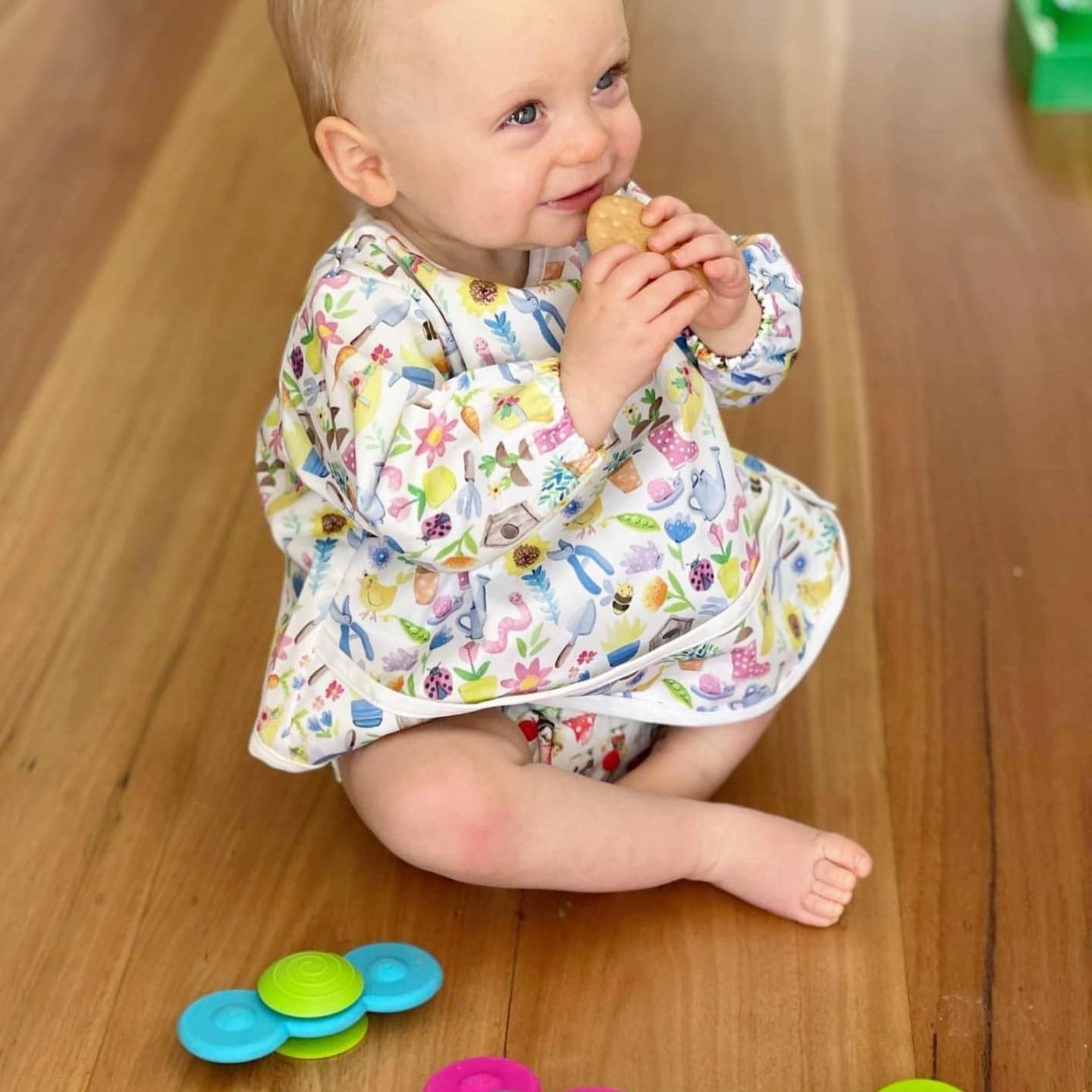 We used these smocks with our first child for weaning and are using them now years later with our second child. When our first was weaned we used them for messy play so they’re really versatile. I love that they come in two sizes so they’re not too big for when babies first start weaning and you can use them for years with the bigger size. They wipe clean and provide really good coverage to keep clothes nice and clean!
