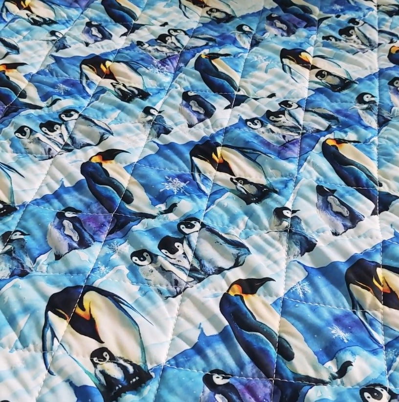 Material: Minky or Polyester printed top, layer of soft wadding inside, PUL printed base all quilted together and bound with a white PUL binding.