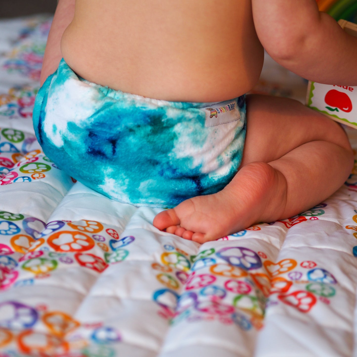 Material: Minky or Polyester printed top, layer of soft wadding inside, PUL printed base all quilted together and bound with a white PUL binding.